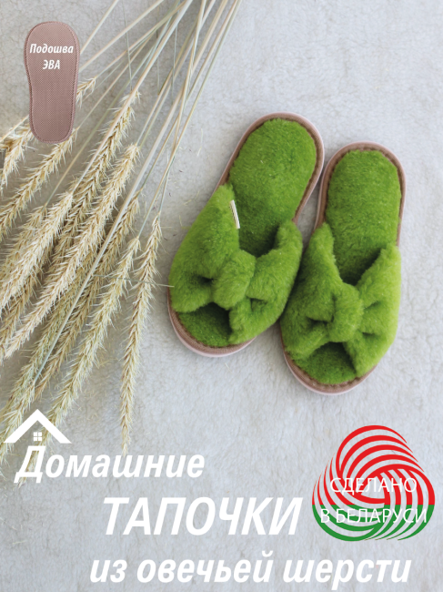 Тапочки домашние из натуральной овечьей шерсти на ЭВА подошве обладают прекрасной терморегуляцией, расслабляющим и массажным эффектом, не раздражают кожу, гипоаллергенны. Уютные тапочки женские из натуральной овечьей шерсти - отлично сохраняют тепло, но при этом позволяют коже дышать, благодаря этому в них не холодно зимой и не жарко летом. Тапочки домашние женские из натуральной овчины на ЭВА подошве, практичны в носке и долговечны (несколько сезонов в тепле и уюте вам обеспечены). Благодаря своим непревзойденным свойствам, тапочки женские домашние станут лучшим подарком для любимых, а так же маме, дочке, бабушке и коллеге. Шерстяные тапочки - это не заменимая обувь для дома и дачи, в гостях, а так же в командировках, в роддоме и больнице. Наши домашние тапочки - это идеальный подарок на праздники: Новый Год, 8 Марта, День Влюбленных, День Рождения. Особая энергетика изделий из натуральной шерсти известна с давних времен. Ведь у животных забирают шерсть, не отнимая жизни, поэтому она несет только положительный заряд! Уход за изделиями из натуральной шерсти: рекомендуется ручная деликатная стирка при t не выше 30 С, без отбеливающих средств, без глажения, сушить изделия необходимо вдали от отопительных приборов и попадания прямых солнечных лучей, расчесать после высыхания. Коллектив ЛанатэксБел будет рад обратной связи, в ваших отзывах и вопросах, наши дорогие покупатели, ведь тем самым вы, поможете стать нам еще лучше для вас.