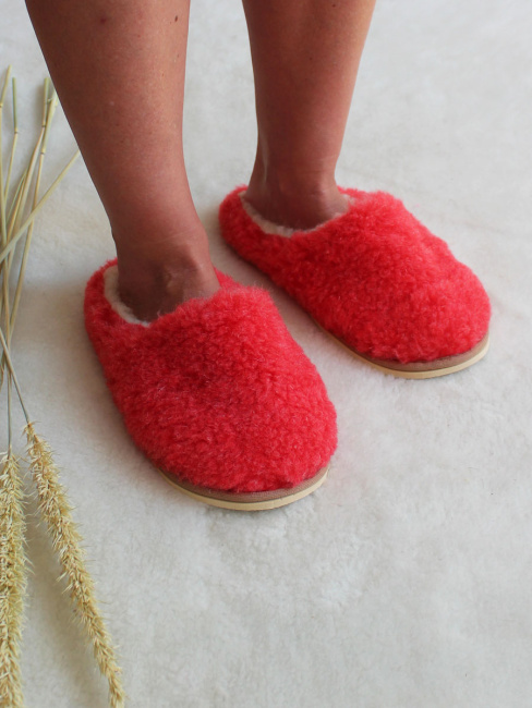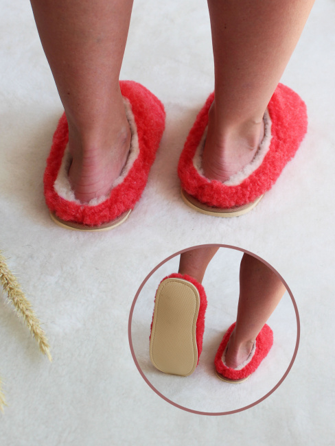 Обувь домашняя пантолеты (тапки) LANATEX из натуральной овечьей шерсти. Подошва - ЭВА. Цвет коралловый/белый. Арт. 22117