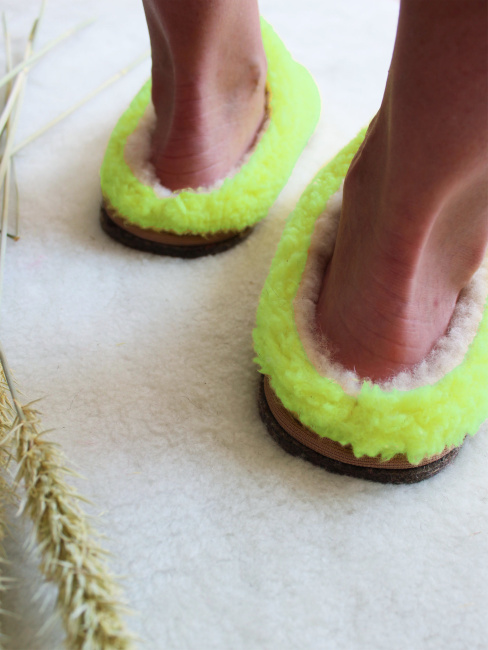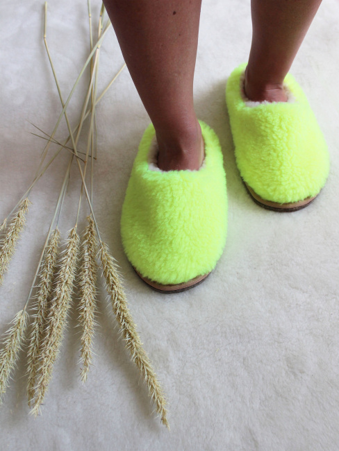 Обувь домашняя пантолеты (тапки) LANATEX из натуральной овечьей шерсти. Подошва - войлок. Цвет ярко-салатовый/белый. Арт. 22124