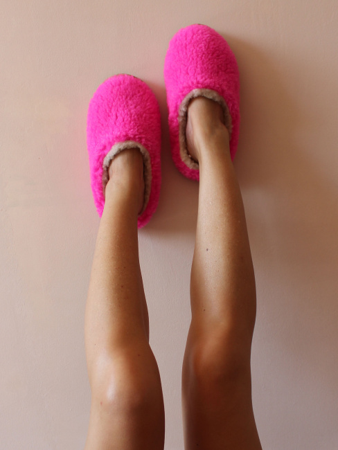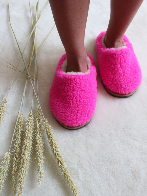 Обувь домашняя пантолеты (тапки) LANATEX из натуральной овечьей шерсти. Подошва - войлок. Цвет фуксия/белый. Арт. 22125