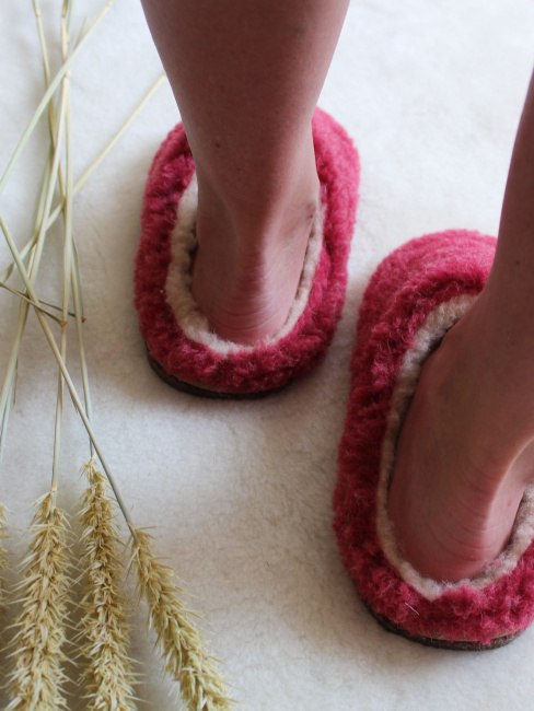 Тапочки домашние из натуральной овечьей шерсти двухцветные с приподнятой пяткой на войлочной подошве обладают прекрасной терморегуляцией, расслабляющим и массажным эффектом, не раздражают кожу, гипоаллергенны. Уютные тапочки из натуральной овечьей шерсти - отлично сохраняют тепло, но при этом позволяют коже дышать, благодаря этому в них не холодно зимой и не жарко летом. Этот универсальный вариант домашних тапочек идеально подойдет как мужчинам так женщинам и детям. Тапочки на войлочной подошве, практичны в носке и долговечны (несколько сезонов в тепле и уюте вам обеспечены). Благодаря своим непревзойденным свойствам, тапочки из натуральной овчины станут лучшим подарком для любимых, а так же маме, папе, бабушке и дедушке. Шерстяные тапочки - это не заменимая обувь для дома и дачи, в гостях, а так же в командировках, в роддоме и больнице. Наши домашние тапочки - это идеальный подарок на праздники: Новый Год, 8 Марта, 23 Февраля, День Влюбленных, День Рождения. Особая энергетика изделий из натуральной шерсти известна с давних времен. Ведь у животных забирают шерсть, не отнимая жизни, поэтому она несет только положительный заряд! Уход за изделиями из натуральной шерсти: рекомендуется ручная деликатная стирка при t не выше 30 С, без отбеливающих средств, без глажения, сушить изделия необходимо вдали от отопительных приборов и попадания прямых солнечных лучей, расчесать после высыхания.