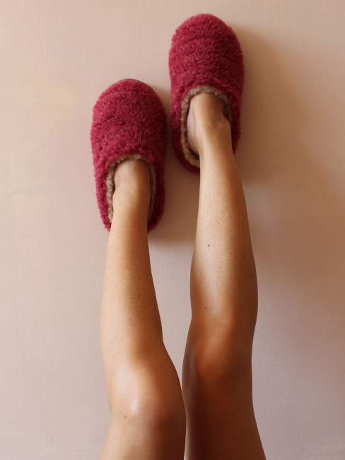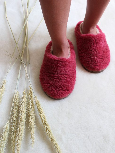 Обувь домашняя пантолеты (тапки) LANATEX из натуральной овечьей шерсти. Подошва - войлок. Цвет бордовый/бежевый. Арт. 22130