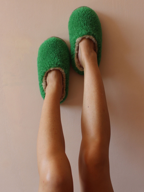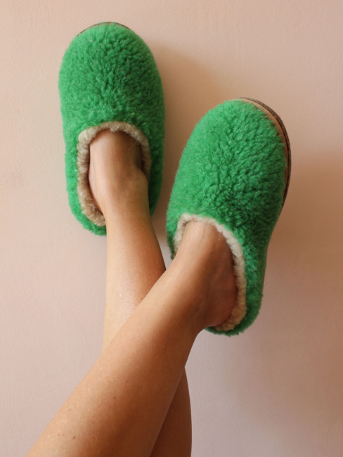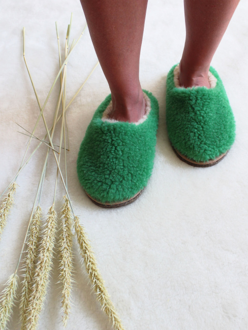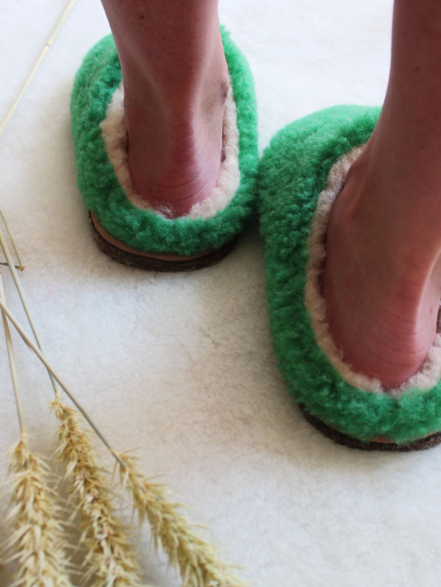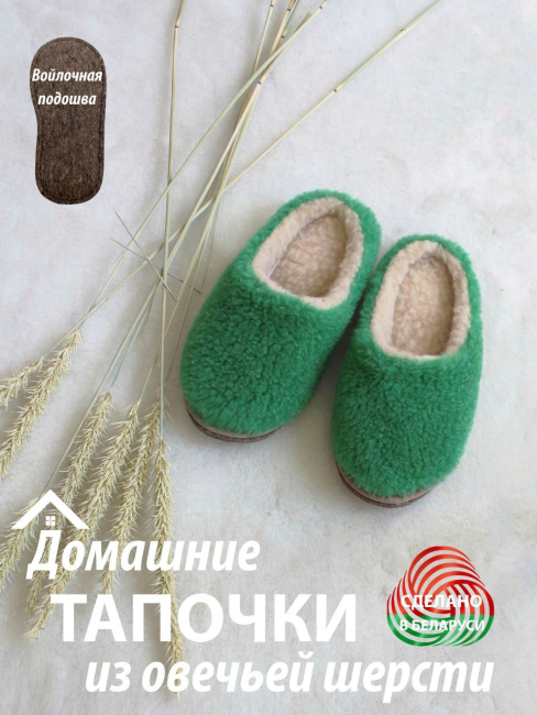 Обувь домашняя пантолеты (тапки) LANATEX из натуральной овечьей шерсти. Подошва - войлок. Цвет зеленый/бежевый. Арт. 22134