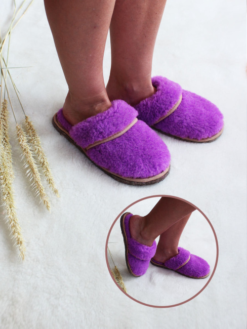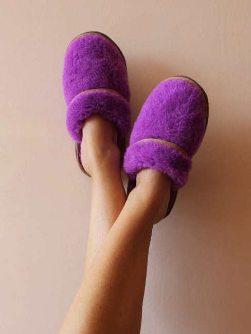 Обувь домашняя пантолеты (тапки) LANATEX из натуральной овечьей шерсти. Подошва - войлок. Цвет фиолетовый. Арт. 2285