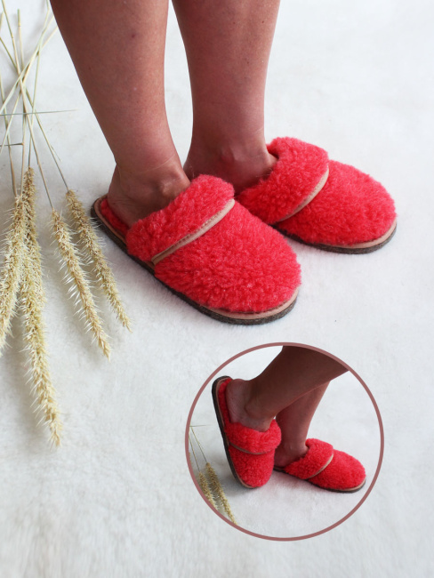 Обувь домашняя пантолеты (тапки) LANATEX из натуральной овечьей шерсти. Подошва - войлок. Цвет коралловый. Арт. 2288