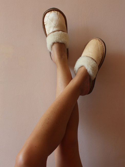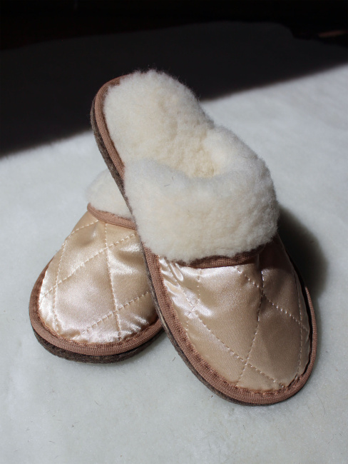 Обувь домашняя пантолеты (тапки) LANATEX из натуральной овечьей шерсти с верхом из атласной ткани. Подошва - войлок. Цвет золотистый. Арт. 2169