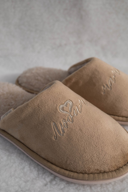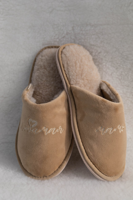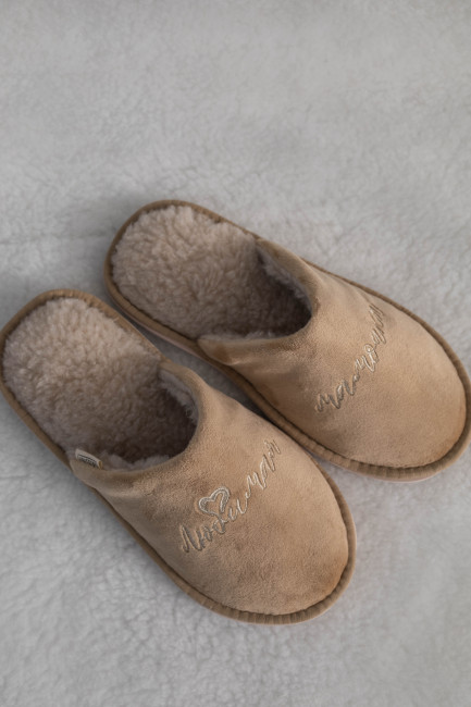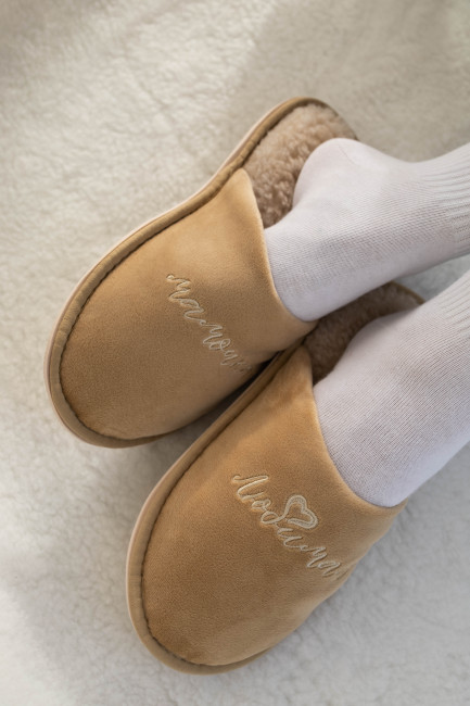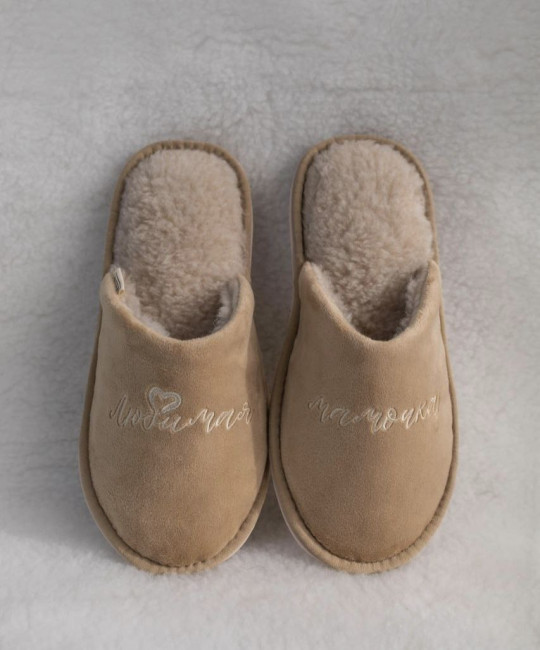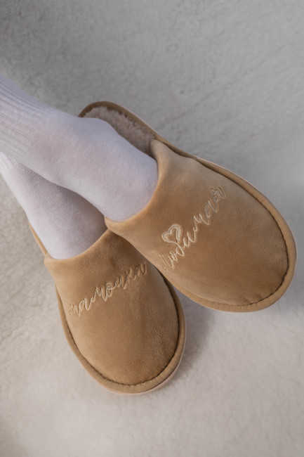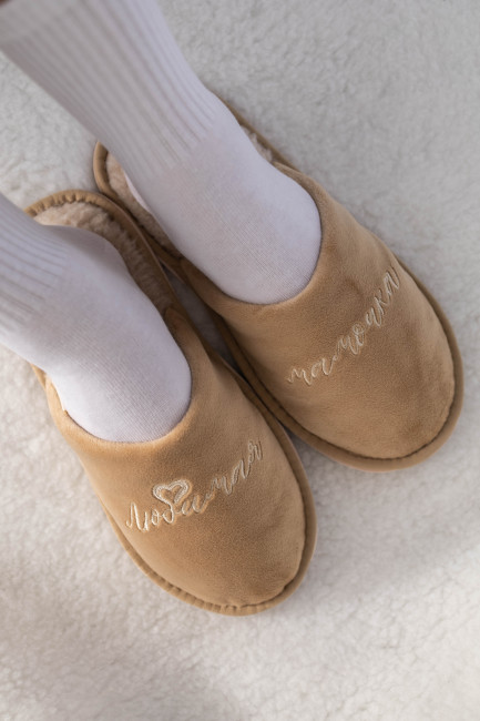 Домашние тапочки для бабушки выполнены в нежном бежевым цвете. Сверху нанесли изящную вышивку “Любимая бабушка”.