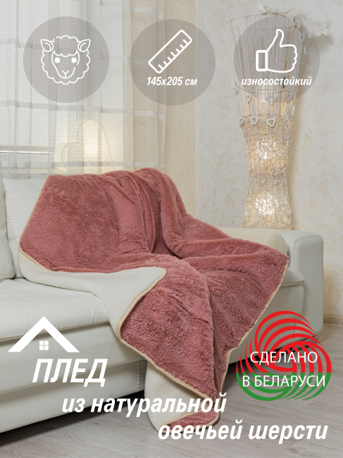 Плед из натуральной овечьей шерсти в сочитании с плюшевым полотном LANATEX 1,5 спальный с открытым ворсом. Это значит, что натуральная овечья шерсть закреплена на трикотажной основе-грунте, из синтетического или натурального волокна в виде кулирного переплетения. Наш плед - одеяло незаменим в любом климате. Когда наступают холода, нет ничего лучше, нырнуть под шерстяное одеяло, наслаждаясь покоем и уютом. В народной медицине уже давно подмечены лечебные свойства натуральной шерсти, одеяла из натуральной овечьей шерсти не только согревают, но и благоприятно действуют на организм человека. Шерсть впитывает влагу, позволяет телу дышать и нейтрализует вредные вещества, которые выделяются с потом. Плед из натуральной овечьей шерсти поможет восстановить и сохранить здоровье. Будет незаменимо как летом, так и зимой так как под ним всегда тепло и комфортно, не жарко летом и тепло зимой. Ворсистая меховая текстура из натуральной шерсти делает нашу постель особенной. Шерстяное одеяло - плед отлично снимает мышечное напряжение и улучшает кровообращение. Постельные принадлежности с открытым шерстяным ворсом подарят вам дополнительную нежность и заботу, сделают ночи более уютными, а сны сладкими и незабываемыми. Приобретая наш плед вы дарите теплоту и заботу себе и своим близким. Шерстяное одеяло - плед - это идеальный подарок на праздники: Новый Год, 8 Марта, 23 Февраля, День Влюбленных, День Рождения, свадьба, новоселье. Уход за изделиями из натуральной шерсти: рекомендуется ручная деликатная стирка при t не выше 30 С, без отбеливающих средств, без глажения, сушить изделия необходимо вдали от отопительных приборов и попадания прямых солнечных лучей, расчесать после высыхания.  Для транспортировки продукция может прессоваться и приходить к покупателю в плоском виде. После вскрытия герметичной упаковки, товар приобретает нужный вид.