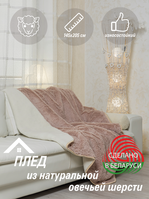 Плед из натуральной овечьей шерсти в сочитании с плюшевым полотном LANATEX 1,5 спальный с открытым ворсом. Это значит, что натуральная овечья шерсть закреплена на трикотажной основе-грунте, из синтетического или натурального волокна в виде кулирного переплетения. Наш плед - одеяло незаменим в любом климате. Когда наступают холода, нет ничего лучше, нырнуть под шерстяное одеяло, наслаждаясь покоем и уютом. В народной медицине уже давно подмечены лечебные свойства натуральной шерсти, одеяла из натуральной овечьей шерсти не только согревают, но и благоприятно действуют на организм человека. Шерсть впитывает влагу, позволяет телу дышать и нейтрализует вредные вещества, которые выделяются с потом. Плед из натуральной овечьей шерсти поможет восстановить и сохранить здоровье. Будет незаменимо как летом, так и зимой так как под ним всегда тепло и комфортно, не жарко летом и тепло зимой. Ворсистая меховая текстура из натуральной шерсти делает нашу постель особенной. Шерстяное одеяло - плед отлично снимает мышечное напряжение и улучшает кровообращение. Постельные принадлежности с открытым шерстяным ворсом подарят вам дополнительную нежность и заботу, сделают ночи более уютными, а сны сладкими и незабываемыми. Приобретая наш плед вы дарите теплоту и заботу себе и своим близким. Шерстяное одеяло - плед - это идеальный подарок на праздники: Новый Год, 8 Марта, 23 Февраля, День Влюбленных, День Рождения, свадьба, новоселье. Уход за изделиями из натуральной шерсти: рекомендуется ручная деликатная стирка при t не выше 30 С, без отбеливающих средств, без глажения, сушить изделия необходимо вдали от отопительных приборов и попадания прямых солнечных лучей, расчесать после высыхания.  Для транспортировки продукция может прессоваться и приходить к покупателю в плоском виде. После вскрытия герметичной упаковки, товар приобретает нужный вид.