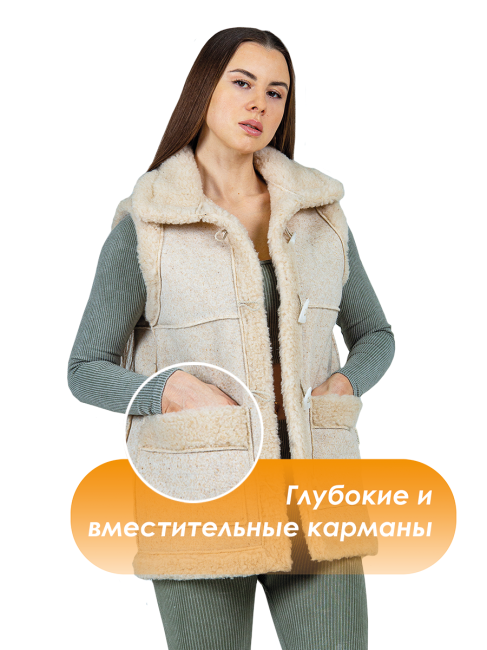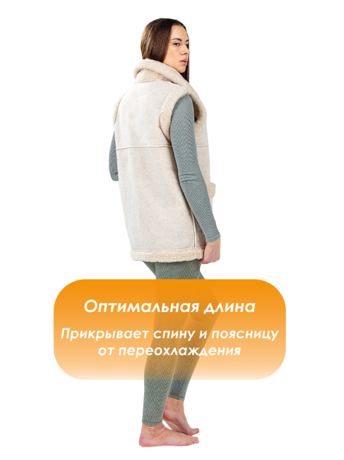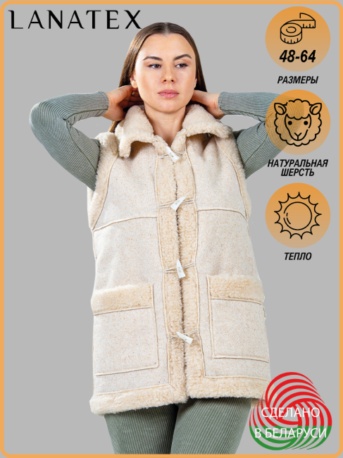 Жилет женский из натуральной овечьей шерсти - нужная вещь на любое время года. Из плюсов. Жилетка женская теплая и приятная к телу. Жилетка женская утепленная спасет в зимний мороз и прохладный летний вечер. Оптимальная длина. Безрукавка женская из овечьей шерсти удлиненная, не даст застудить спину и поясницу. Практичность и комфорт. Жилетка женская теплая, её можно надевать на любую одежду - водолазку, кофту, рубашку, джемпер. Надевайте жилет меховой женский на работу, носите жилет из овчины на даче, работайте в нем в саду, прогуливайтесь вечером или наслаждайтесь отдыхом на природе. Удобство. Утепленный жилет из шерсти бежевый лаконично дополнит любой образ. А во вместительные карманы можно положить телефон, ключи и другие нужные вещи. Теплый жилет станет отличным подарком. Любители природы, дачи, рыбалки, охоты и путешествий оценят меховой жилет натуральный белорусского производителя LANATEX. Меховой жилет дополнен декоративными пуговицами и отложным воротником, который можно поднять.