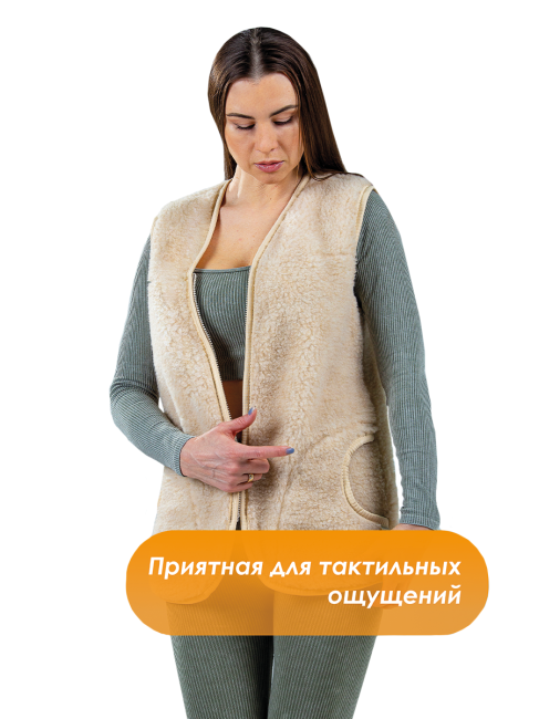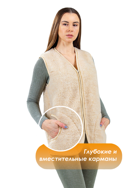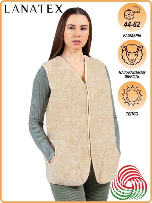 Женская бежевая жилетка из натуральной овечьей шерсти LANATEX, мягкая и теплая. Безрукавка женская с мехом - уютное и стильное дополнение к любому гардеробу на любое время года. Шерстяной жилет, обеспечивает тепло и комфорт даже в самые прохладные дни. Теплый меховой жилет для женщин можно надевать на любую одежду - водолазку, кофту, блузку, джемпер. Ходите в жилете женском с мехом на работу, носите на даче, работайте в нем в саду, прогуливайтесь вечером или наслаждайтесь отдыхом на природе. В народной медицине уже давно подмечены лечебные свойства шерсти, жилеты из натуральной овчины не только согревают, но и благоприятно действуют на организм человека. Мягкий, экологичный и теплый жакет, но при этом очень легкая классическая жилетка будет незаменима для офиса или дома. Натуральная шерсть, уютный высокий воротник и большие карманы женского жилета из натуральной овечьей шерсти, не дадут вам замерзнуть в холодное время года. Элегантный свободный крой и прямой силуэт, этого мехового жакета подойдет для любой фигуры. Безрукавка идеально подойдет для офисных и повседневных образов и как одежда для дома. Классический жилет лучше носить как верхний слой. Теплые, большие карманы жилета, согреют руки и сохранят телефон. Большие размеры безрукавки женской, позволят укутать нежным теплом, любую женщину. Жилет с карманами, теплый, полезный подарок маме на 8 марта, милый подарок девушке на день рождения, лечебный подарок бабушке на юбилей. Стирать рекомендуем лучше вручную в воде не выше +30 С, без отбеливающих средств, без глажения, сушить изделия необходимо вдали от отопительных приборов и попадания прямых солнечных лучей, расчесать после высыхания. Коллектив ЛанатэксБел будет рад обратной связи, в ваших отзывах и вопросах, наши дорогие покупатели, ведь тем самым вы, поможете стать нам еще лучше для вас. Стильный меховой жилет без рукавов, универсальная офисная одежда для женщин, любящих комфорт, уют и натуральные материалы