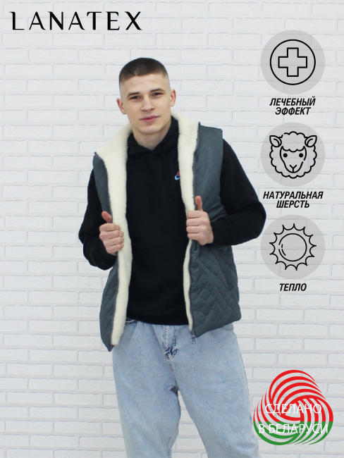 Мужская жилетка LANATEX - базовый элемент гардероба на любое время года, который позволит себя чувствовать комфортно в прохладные дни. Жилет мужской на молнии входит в линейку модных вещей для мужчин. Ткань верха плащевка с водоотталкивающим покрытием, в качестве подкладки используется мех из натуральной овечьей шерсти белорусского производства, дополнительное утепление 100 г/м утеплитель синтепон. Жилетка из овечьей шерсти подойдёт на рост 176 см. Легко стирается и в стиральной машине без отжима при температуре 30 градусов, и вручную без отбеливающих средств, без глажения, сушить изделия необходимо вдали от отопительных приборов и попадания прямых солнечных лучей, расчесать после высыхания. Шерстяная жилетка отлично снимает мышечное напряжение и улучшает кровообращение. Овечья шерсть содержит ланолин - естественный антисептик. Именно он препятствует размножению бактерий и появлению неприятных запахов. Жилетка мужская утепленная - это идеальный подарок на праздники: Новый Год, 23 февраля, День Влюбленных, День Рождения, новоселье.