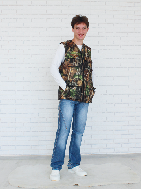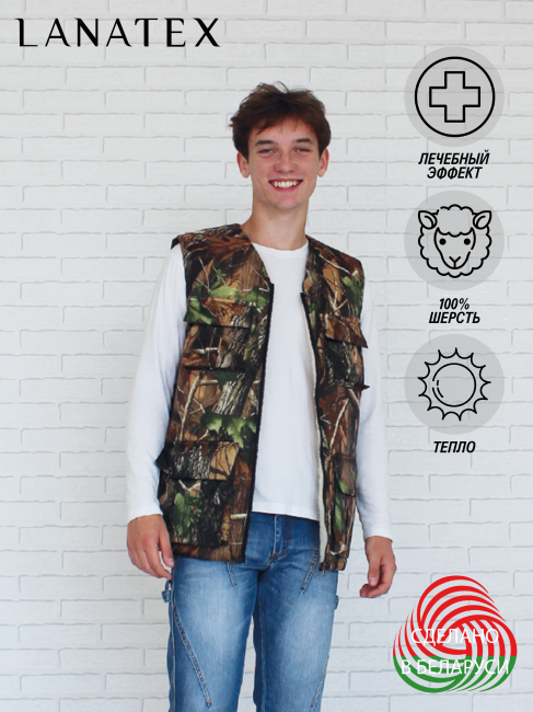 Жилет мужской из натуральной овечьей шерсти. Благодаря составу материалов высокого качества, жилет прослужит долгое время. В составе подкладки безрукавки ворсовое полотно из натуральной овечьей шерсти. Состав ворса: 80% шерсти, 20% лавсан. Верхняя часть жилетки - плащевая камуфляжная ткань с пропиткой выполняет влагозащитную функцию. Жилет демисезонный мужской спасёт от сильного ветра, сквозняка, обильных осадков в виде мокрого снега и дождя. Безрукавка шерстяная будет актуальна водителям, дальнобойщикам, рыболовам, охотникам, собственникам частных домов, дач, участков. Наши жилеты - это идеальный подарок на праздники: Новый Год, День Влюбленных, День Рождения, День автомобилиста. Жилетка с двумя глубокими карманами удобна для переноса документов, телефона, ключей и разных необходимых мелочей. Внутренняя сторона изделия смоделирована из шерстяного полотна на трикотажной основе с добавлением овчины. Шерстяное волокно создает эффект массажа и обеспечивает сухое тепло. Жилет гипоаллергенный исключает раздражение, излишнюю потливость и неприятный запах.