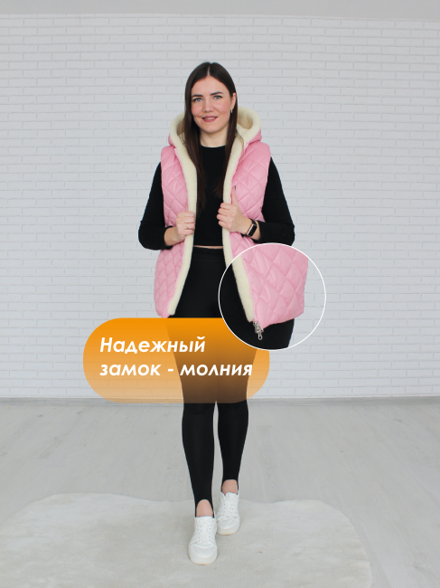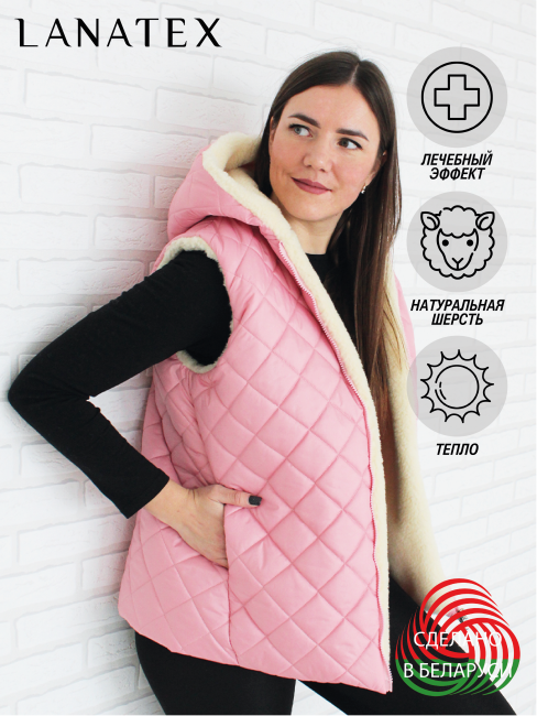 Женская жилетка с капюшоном LANATEX - базовый элемент гардероба на любое время года. Жилет женский на молнии входит в линейку модных вещей для женщин. Ткань верха плащевка с водоотталкивающим покрытием, в качестве подкладки используется мех из натуральной овечьей шерсти. Жилетка из овечьей шерсти подойдёт на рост 158-175 см. Теплый меховой жилет для женщин можно надевать на любую одежду - водолазку, кофту, блузку, джемпер. Ходите в жакете женском с мехом на работу, носите на даче, работайте в нем в саду, прогуливайтесь вечером или наслаждайтесь отдыхом на природе. В народной медицине уже давно подмечены лечебные свойства шерсти, жилеты из натуральной овечьей шерсти не только согревают, но и благоприятно действуют на организм человека. Мягкая, экологичная и теплая, но при этом очень легкая классическая жилетка будет незаменима для офиса или дома. Натуральная шерсть, капюшон и большие карманы женского жилета из натуральной овчины, не дадут вам замерзнуть в холодное время года. Элегантный свободный крой и прямой силуэт, этого мехового жакета подойдет для любой фигуры. Безрукавка идеально подойдет для офисных и повседневных образов и как одежда для дома. Классический жилет лучше носить как верхний слой. Теплые, большие карманы жилета, согреют руки и сохранят телефон. Большие размеры безрукавки женской, позволят укутать нежным теплом, любую женщину. Жилет с карманами, теплый, полезный подарок маме на 8 марта, милый подарок девушке на день рождения, лечебный подарок бабушке на юбилей. Стирать рекомендуем вручную в воде не выше +30 С, без отбеливающих средств, без глажения, сушить изделия необходимо вдали от отопительных приборов и попадания прямых солнечных лучей, расчесать после высыхания. Коллектив ЛанатэксБел будет рад обратной связи, в ваших отзывах и вопросах, наши дорогие покупатели, ведь тем самым вы, поможете стать нам еще лучше для вас. Стильный меховой жилет без рукавов, универсальная офисная одежда для женщин, любящих комфорт, уют и натуральные материалы.