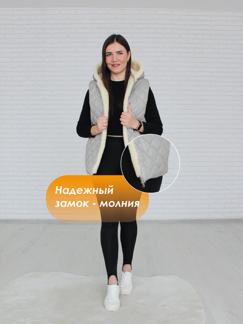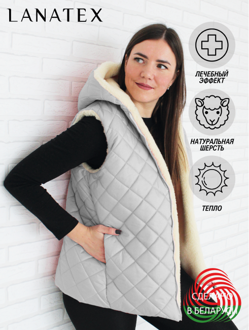 Женская жилетка с капюшоном LANATEX - базовый элемент гардероба на любое время года. Жилет женский на молнии входит в линейку модных вещей для женщин. Ткань верха плащевка с водоотталкивающим покрытием, в качестве подкладки используется мех из натуральной овечьей шерсти. Жилетка из овечьей шерсти подойдёт на рост 158-175 см. Теплый меховой жилет для женщин можно надевать на любую одежду - водолазку, кофту, блузку, джемпер. Ходите в жакете женском с мехом на работу, носите на даче, работайте в нем в саду, прогуливайтесь вечером или наслаждайтесь отдыхом на природе. В народной медицине уже давно подмечены лечебные свойства шерсти, жилеты из натуральной овечьей шерсти не только согревают, но и благоприятно действуют на организм человека. Мягкая, экологичная и теплая, но при этом очень легкая классическая жилетка будет незаменима для офиса или дома. Натуральная шерсть, капюшон и большие карманы женского жилета из натуральной овчины, не дадут вам замерзнуть в холодное время года. Элегантный свободный крой и прямой силуэт, этого мехового жакета подойдет для любой фигуры. Безрукавка идеально подойдет для офисных и повседневных образов и как одежда для дома. Классический жилет лучше носить как верхний слой. Теплые, большие карманы жилета, согреют руки и сохранят телефон. Большие размеры безрукавки женской, позволят укутать нежным теплом, любую женщину. Жилет с карманами, теплый, полезный подарок маме на 8 марта, милый подарок девушке на день рождения, лечебный подарок бабушке на юбилей. Стирать рекомендуем вручную в воде не выше +30 С, без отбеливающих средств, без глажения, сушить изделия необходимо вдали от отопительных приборов и попадания прямых солнечных лучей, расчесать после высыхания. Коллектив ЛанатэксБел будет рад обратной связи, в ваших отзывах и вопросах, наши дорогие покупатели, ведь тем самым вы, поможете стать нам еще лучше для вас. Стильный меховой жилет без рукавов, универсальная офисная одежда для женщин, любящих комфорт, уют и натуральные материалы.