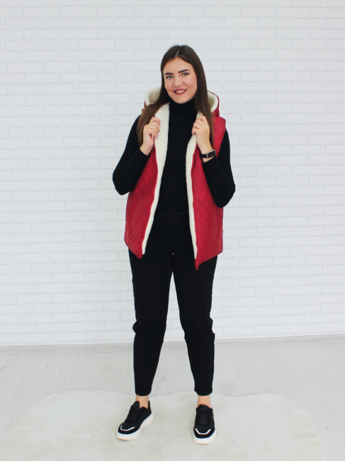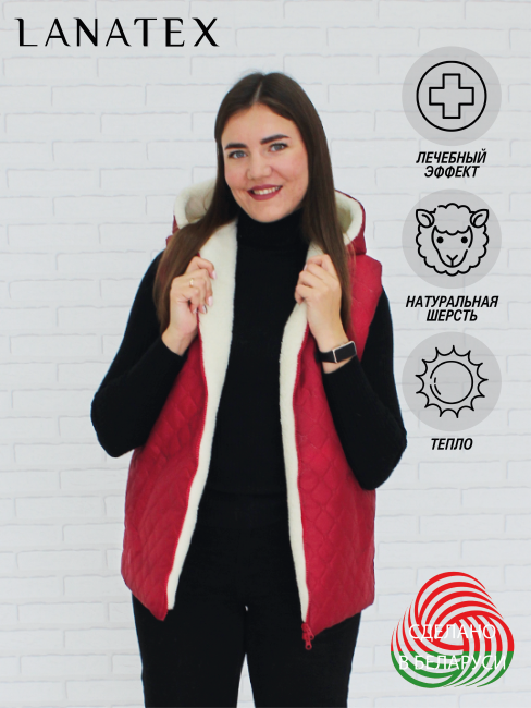 Женская жилетка с капюшоном LANATEX - базовый элемент гардероба на любое время года, который позволит себя чувствовать комфортно в прохладные дни. Жилет женский на молнии входит в линейку модных вещей для женщин. Ткань верха плащевка с водоотталкивающим покрытием, в качестве подкладки используется мех из натуральной овечьей шерсти белорусского производства, дополнительное утепление 100 г/м утеплитель синтепон. Жилетка из овечьей шерсти подойдёт на рост 158-175 см. Легко стирается и в стиральной машине без отжима при температуре 30 градусов, и вручную без отбеливающих средств, без глажения, сушить изделия необходимо вдали от отопительных приборов и попадания прямых солнечных лучей, расчесать после высыхания. Шерстяная жилетка отлично снимает мышечное напряжение и улучшает кровообращение. Овечья шерсть содержит ланолин - естественный антисептик. Именно он препятствует размножению бактерий и появлению неприятных запахов. Жилетка женская утепленная - это идеальный подарок на праздники: Новый Год, 8 Марта, День Влюбленных, День Рождения, День матери, новоселье.