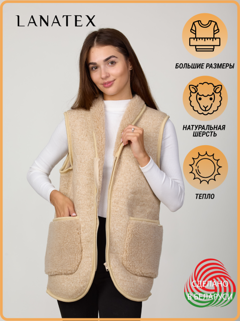 Станет отличным подарком для родных и близких людей. Любители природы, дачи, рыбалки, охоты и путешествий, а так же пожилые люди будут в восторге от уютного жилета из натуральной овечьей шерсти белорусского производителя LANATEX.